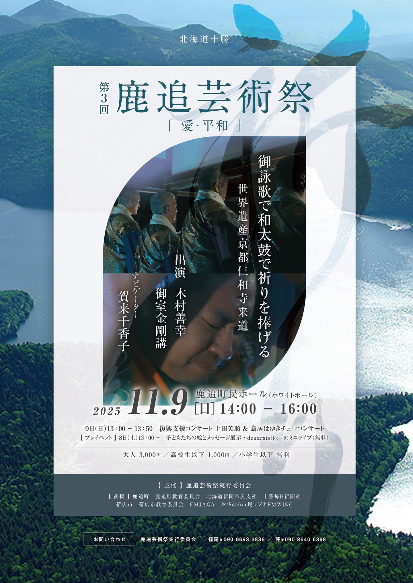 タイトル | 第3回 鹿追芸術祭「愛・平和」 御詠歌で和大太鼓で祈りを捧げる世界遺産京都仁和寺来道 |